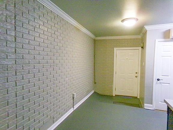 Stainless steel appliancesBrick wallsCrown mouldingNewer lights and vanity
