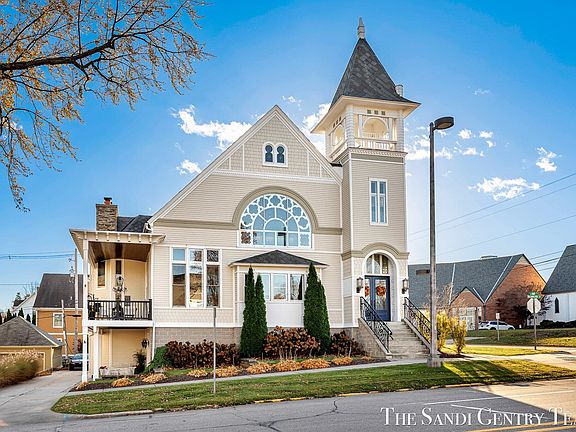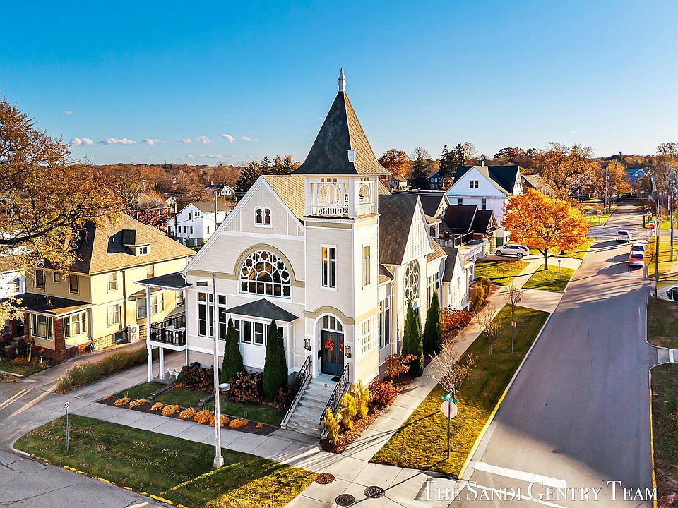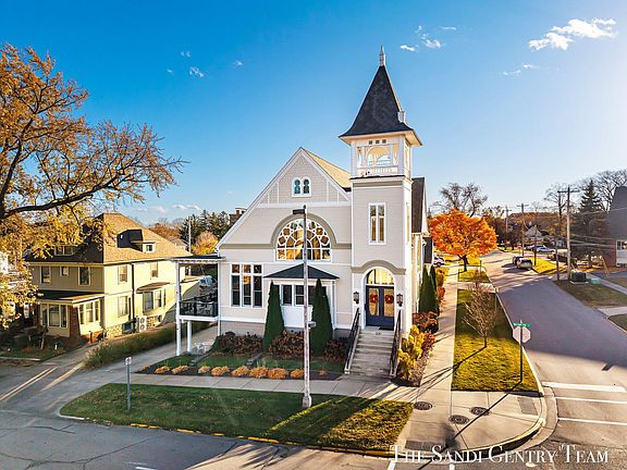 A true Grand Haven icon, this one-of-a-kind historic landmark has been masterfully transformed into nearly 8,000 sq. ft. of exceptional living space, where timeless architecture meets refined modern design. Every inch of this remarkable residence has been reimagined through two years of inspired craftsmanship, honoring the past while embracing contemporary elegance. From the moment you step inside, the artistry is undeniable. Original wood pews, doors, beams, and ceilings have been carefully restored and repurposed, creating warmth and authenticity that cannot be replicated. The soaring wood-clad ceilings and stained-glass windows fill the great room with light and color, while a sweeping staircase and custom iron railings showcase exceptional craftsmanship in every detail. The grand living area is both elegant and inviting, anchored by a massive stone fireplace and intricate millwork that celebrates the home's architectural heritage. The open layout flows effortlessly into a stunning gourmet kitchen designed for both entertaining and everyday living. Here, form meets function with custom cabinetry, a curved granite island, hand-laid tile backsplash, Wolf appliances, and integrated storage that blends beauty with practicality. The main-floor primary suite is a serene retreat with vaulted ceilings, a stone fireplace, and a spa-inspired bathroom featuring heated floors, dual vanities, a soaking tub, and a custom walk-in shower framed by original arched woodwork. Every element, from the lighting to the trim, has been curated with timeless precision. Upstairs, a spacious family room with wet bar overlooks the great room below and leads to a private rooftop deck. A luxurious pool and cabana create a resort-like outdoor oasis, perfect for relaxing or entertaining guests in style. The lower level continues the home's story of craftsmanship and comfort. Enjoy a custom bar with reclaimed wood finishes, a billiards room, golf simulator, temperature-controlled wine cellar, and a guest suite. Every space reflects quality design and thoughtful detail. With 3 bedrooms, 3 full baths, and 3 half baths, this home offers the perfect balance of luxury and livability. Additional features include in-floor heating, smart home systems, state-of-the-art lighting and sound, and a five-stall garage that blends seamlessly with the home's design. Perfectly located near downtown Grand Haven, this residence offers easy access to charming shops, inviting cafés, and local restaurants. Just a short stroll away, enjoy the scenic boardwalk that leads to the musical fountain, the iconic pier and its twin lighthouses, along with the soft sandy beaches and sparkling waters of Lake Michigan. Every inch of this home reflects vision, artistry, and passion. It is more than a place to live it is a living work of art, crafted for the one discerning buyer who appreciates history, design, and the art of exceptional living.