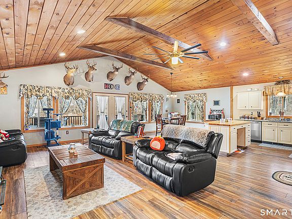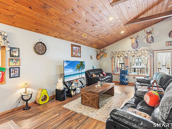 Welcome to 600 Woodtick Rd in Wolcott. This inviting home features a bright, open main level with cathedral ceilings, exposed wood beams, and recessed lighting that create a warm and airy atmosphere. The spacious layout blends the living room, dining area, and kitchen into one cohesive space-perfect for entertaining. The kitchen stands out with a large center island, granite countertops, and stainless steel appliances, offering both style and functionality. The main level includes a primary bedroom with its own ensuite bath, a second well-sized bedroom, and an additional full bath. The finished lower level provides exceptional flexibility, featuring a studio-style in-law or guest suite complete with its own kitchen, full bath, and private entrance. Ideal for extended family, visitors, or potential supplemental living space. Move-in ready and thoughtfully designed, this home delivers comfortable modern living with room for everyone.