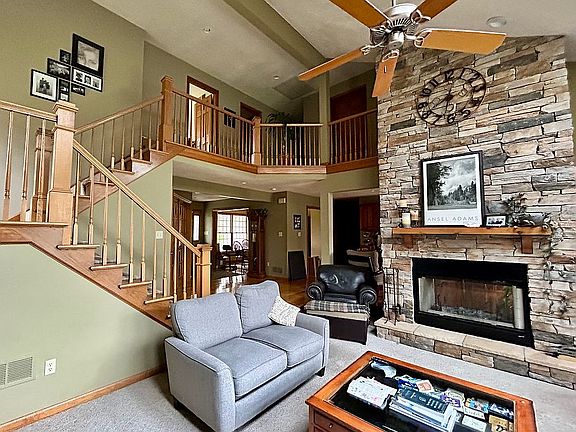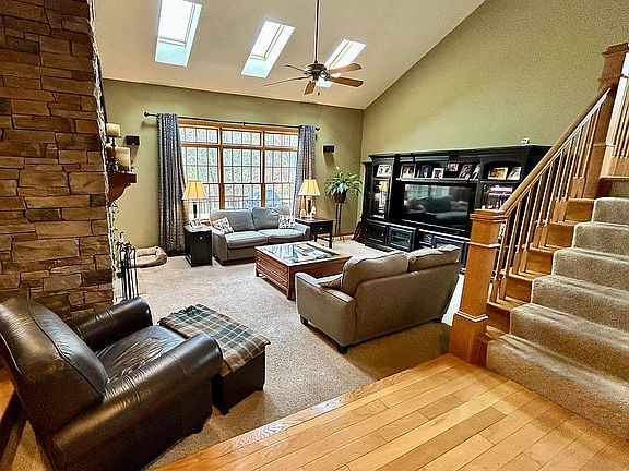 Step inside to find a spacious layout with warm hardwood floors, a sun-drenched two-story family room with skylights, and a stunning stone fireplace. The open kitchen features granite countertops, stainless steel appliances, a center island, and custom cabinetry—perfect for family meals and entertaining.