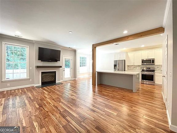 Welcome to 6000 Hunter Hall Ct, a private retreat on a cul-de-sac in one of Norcross's most charming hidden communities. With only 12 homes on the street, this residence enjoys the most private lot, bordered by woods on two sides. You're just a short stroll from Downtown Norcross, parks, concerts at Thrasher Park, local dining, and the family-friendly Cultivation Brewery, a perfect blend of seclusion and walkability. Inside, the home is fully renovated and move-in ready, with fresh interior and exterior paint, new carpet, updated hardwoods, and modern smart-home features. The open-concept living area centers around a cozy gas fireplace and flows into a custom designer kitchen with quartz countertops, soft-close cabinetry with pull-out drawers, stainless appliances, and a large entertaining island. The owner's suite features a spa-like walk-in tile shower, dual vanities, and built-in tablets. Two additional bedrooms plus an updated bath offer flexibility for family, guests, or office use. Step outside to a paver patio and wooded backdrop, creating a private, low-maintenance yard rarely found this close to downtown. Enjoy friendly neighborhood deer strolling by or listen to the birds while sipping your morning coffee. With landscaping included in a low HOA, at a fraction of the cost of nearby townhomes, you'll enjoy convenience without compromise. This home delivers the perfect mix of privacy, walkability, and modern living, fully turnkey and ready for you to move in and start enjoying immediately - a standout opportunity in Historic Norcross.