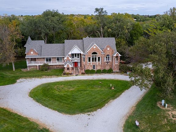 Unique all-brick, castle-style home on nearly 5 wooded acres! Completely updated throughout, this property features a wraparound balcony with outdoor access from each bedroom, offering stunning views of the natural setting. The front entry is grand and features a koi pond with waterfall to greet you as you make your way to the front door. Inside, you'll find spacious living areas filled with character and modern updates including the kitchen, primary suite and bathrooms! This home features 5 bedrooms, an office, 5 bathrooms, 3 fireplaces, an attached 2 stall garage and lots of storage space! Outside you will find mature trees, and a stream running through the property complete with a bridge and a few trails to explore and enjoy! This home comes complete with outdoor sprinklers, as well as 2 large outbuildings. Enjoy the perfect balance of privacy, nature, and distinctive architecture with this in town acreage!