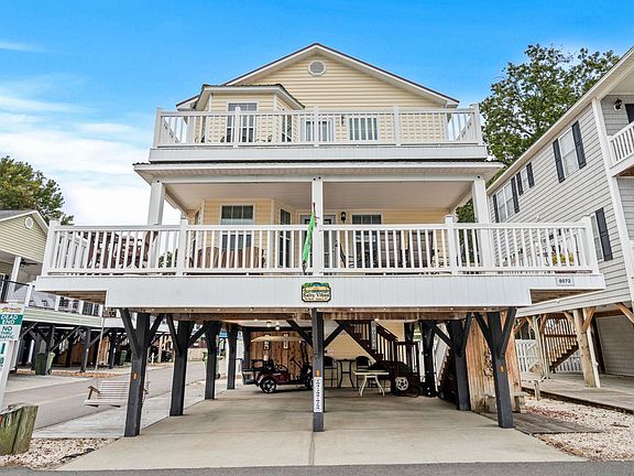 Welcome to 8072 in Ocean Lakes! This CORNER LOT North facing 4 bedroom 3 bath raised beach house is a must see, located in the desirable 8000 section of Ocean Lakes and being sold fully furnished. This incredible home has side steps leading to a large covered deck that wraps-around to the Eastside of the home, covered steps leading into this home, plenty of parking, and a golf cart garage. Entering inside this beauty is large living room to the right, dining area with high-top table with seating for 8 and reading nook with a recliner. Kitchen has granite counters, breakfast bar with seating for 2, plenty of cabinets, and pantry. The covered steps leads into the kitchen for easy access with groceries. First floor bedroom has a king size bed with attached bedroom with tub/shower combo. Upstairs is another HUGE primary bedroom with attached bath and private access to the upstairs deck. This bedroom has a king size bed and full bath has a tub/shower combo. Bedroom #3 has a queen bed with access to full bath #3 and bedroom #4 also has a queen bed. Full size washer/dryer is located upstairs across from full bath #3. Enclosed outdoor shower with hot and cold water is located on the Westside of the home, ground level. Don't delay, schedule your showing today!