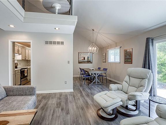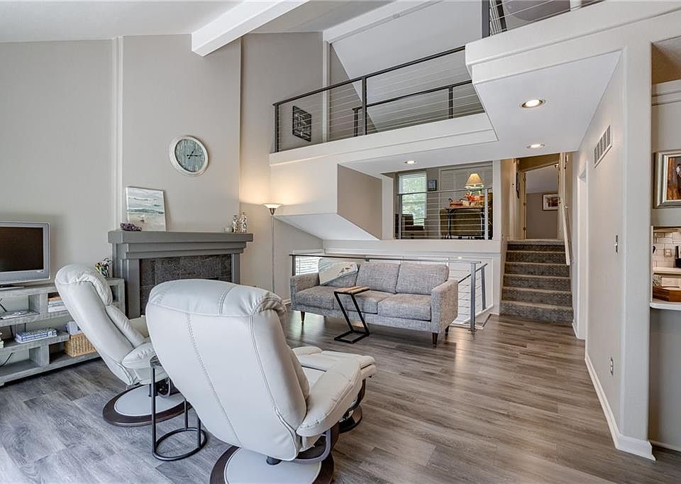 There is so much NEW to love in this swanky 2-bedroom lofted townhome. This townhome boasts modern design in a fully renovated kitchen with quartz counters and stainless steel appliances to match the stainless steel railing throughout. Lounge on the back patio or create away in the upstairs loft. Cozy by the fireplace in the fall or enjoy the neighborhood pool in the summer. The owner's suite has soaring ceilings, three closets, and an en-suite bathroom! A second full bathroom is available for guests on the second floor along with a second room with access to the 3rd floor loft. Just minutes from River Market with all the conveniences of Gladstone. Enjoy easy access to shopping and I-35. Imagine coming home to the ease of the suburbs with all the maintenance perks of townhome living. Lawn and roofs maintained by the HOA.