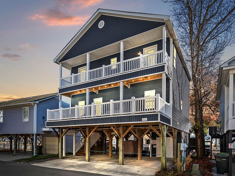 Very well maintained, like-new lakefront home built in 2018 offering 4 bedrooms and 3.5 bathrooms, perfectly positioned on a peaceful lake in Unit N121 within Ocean Lakes Family Campground. This impressive property is sold fully furnished, includes one golf cart, provides ample parking, and comfortably sleeps up to 12 — making it an ideal setup for large families or to maximize rental potential. Inside, the open layout features quartz countertops, stainless steel appliances, LVP flooring throughout, and tile bathrooms that give the home a clean, modern coastal feel. The main living space offers a welcoming atmosphere with bar seating, recessed lighting, and plenty of room for gathering and entertaining. Spacious bedrooms provide comfort and privacy throughout the home. Outdoor living truly shines with four huge decks overlooking the lake and an expansive area beneath the home perfect for entertaining, grilling, and relaxing in the shade. The raised design also provides generous covered parking and storage, adding functionality to this already impressive setup. This lakefront property delivers space, upgrades, and an unbeatable setting inside Ocean Lakes — offering the perfect balance of beach lifestyle, comfort, and investment opportunity.
