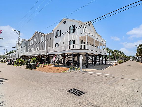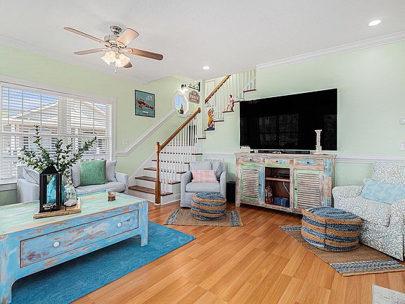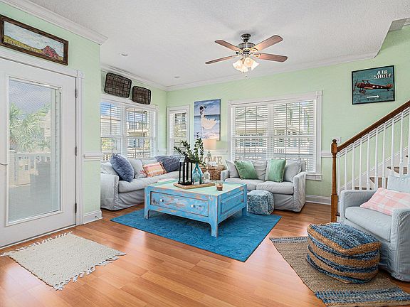 Coastal living at its best, house situated on a beautiful lake and just a few blocks from the ocean. This four bedroom 3 1/2 bath home is currently laid out with four bedrooms and a second living room, can be converted to five bedrooms. Home has never been rented. Features custom kitchen cabinets, granite countertops, and stainless steel appliances. Primary bedroom on first floor with private door to the side deck. Wood floors throughout, no carpeting. Spacious bedrooms, all with ceiling fans. Home has covered decking on three sides of the home. Outside shower, storage garage under house with Heat& Air and also plumbed for another washer and dryer and ice maker. Home is fully furnished, including all decor. Large outdoor space with decks overlooking the lake.