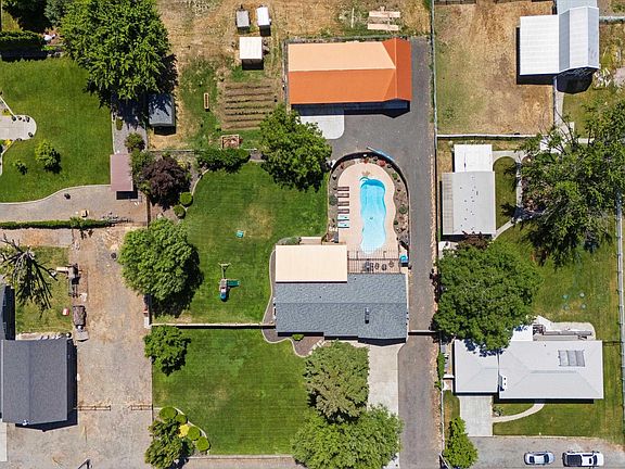 MLS# 276195 Have you been wanting that dream shop, entertainers pool/patio, and irrigated pastures for your animals, but job or schools prevent you from moving further out of town? Welcome to a dream mini ranchette. This 4 bedroom home with 3 baths on 1.98 irrigated acres IN TOWN, awaits. This 2626 square foot rambler with basement offers original hardwood floors, fireplace and updated kitchen and bathrooms. Kitchen is accented by the new LVP floors and granite countertops. The main floor master suite has been expanded and has an ensuite with tiled shower and floors with sliding doors for access to the porch. Also located on the main are two additional bedrooms and a second bath with ADA accessibility with a zero entry shower. Downstairs we find another family room with built ins, the 4th bedroom, 2 more flex spaces (with egress windows) and the 3rd bathroom offering tiled shower. Outside we find an entertainers dream backyard/patio. The gorgeous, covered porch with hot tub and pergola offers plenty of room for outdoor gatherings, firepits, cocktail hour, BBQ's you name it. Also wired for surround sound, it is the perfect place to relax and look out over your stunning garden and acreage. In ground HEATED fiberglass pool is 8.5 feet deep with a swimming ledge and accent lighting at night. Plumbed for fountains, the pool deck is a stained cement with cooling salt finish. The outdoor changing room is plumbed for an outdoor shower. Zoned Residential Ag. means 1 large animal per half acre is allowed including horses, cows etc. and up to 6 smaller animals. Paved access makes hay delivery or trailer parking a snap. Fully fenced pasture is ready for animals today. Add a barn and or outdoor arena? Separate fenced front yard, fully fenced backyard, play area, separated fence and irrigated garden area with walnut and apple trees for everyone's enjoyment. The 24x64 shop has vaulted ceilings and 4 slanted doors designed for optimal lift access, plenty of storage, a separate 300 amp panel, tin roof and a loft area. There is plumbing in place for a half bath in the shop. 240V RV hook up with gated entrance. New in 2023:New Stove,New Roof/ gutters, Fence around pool (compliant),All popcorn ceilings removed, interior paint, new flooring in basement, irrigated garden area and 12X16 Shed, Hot tub. . If farm life is not for you? The acreage is dividable, adding further value and opportunities .Come take a peek at your new oasis, with something for everyone!