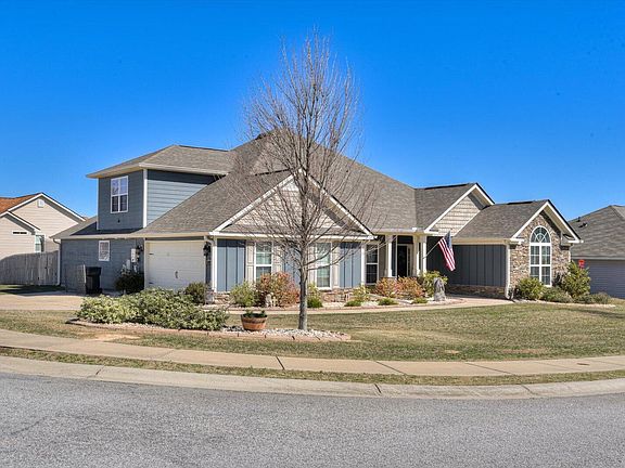 Luxury home for sale boasts a prime corner lot location, side entry double car attached garage and extra wide driveway for additional parking, quality craftsmanship with high end finishes plus roof solar panels to offset your energy bills in top selling Hayne's Station at Fort Eisenhower, GA. Featuring hardwood flooring and granite countertops throughout the home and ceramic tile in all bathrooms. Ranch home with a secluded 4th bedroom and full bathroom suite upstairs. Covered front porch with stone base pillars. Step over the threshold into the welcoming foyer featuring walls lined with wainscotting and hooks to keep your home organized. Directly to the left is the formal dining room offering a coffered ceiling and wainscotting. Walk through the archways into an open living room with raised ceiling and fireplace with stone surround and raised hearth with French door leading to sunroom flooded with natural light. The living room is completely open to the modern gourmet kitchen featuring a huge granite kitchen island with overhang for additional seating. Stainless steel appliances; smooth cooktop, vent hood microwave, dishwasher and refrigerator with bottom freezer and recessed lighting. Cheery breakfast room offers casual dining space. Alcove off the breakfast room has more granite counter space and cabinetry. Downstairs primary bedroom has trey ceiling and additional cozy reading/sitting room with fireplace. Ensuite bathroom has granite countertop with double sink, soaking tub and separate 4 foot tile shower and private commode room. Bedroom 2 and Bedroom 3 are placed off the foyer as a separate suite area and have vaulted ceilings and large closets, a shared full bathroom completes the suite area. A private stair case leads to the huge upstairs bedroom 4 suite. with walk in closet and private bathroom. Manicured fully landscaped yard featuring automatic sprinklers and sod with privacy fenced backyard. Sidewalks and streetlights throughout the community to promote healthy living. Community pool and pavilion will keep you cool in the summer months. 2 miles to Fort Eisenhower Gate 1 and Gate 6.