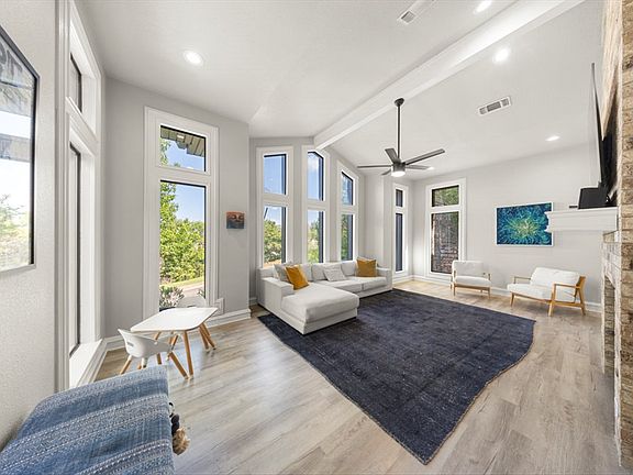 Step inside to find soaring vaulted ceilings, a dramatic wall of windows, and a cozy brick fireplace designed for relaxed living. The elevated formal dining area brings elegance to everyday meals, while the open-concept kitchen features stainless steel appliances, quartz countertops, shaker-style cabinets, and a sunlit breakfast nook.
