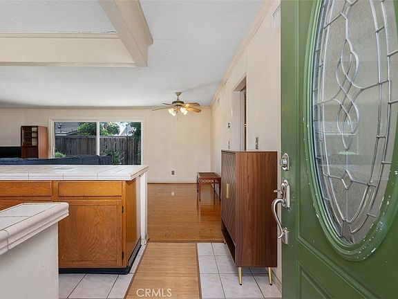 This lovely beach homes resides on an over sized lot at the end of a cul-de-sac with possible RV access. Once inside, you are greeted by a formal living room with a fireplace. There is a large dining area which flows into the kitchen. The kitchen features tile counter tops, a gas cook top and a large pantry. All of the bedrooms are carpeted and offer ceiling fans. The primary bedroom is quietly situated at the rear of the home and features a French slider leading to the rear yard. The hall bath features a bathtub/shower combo with tiled surround, tile countered vanity and tile flooring. The primary bathroom offers a shower and tile flooring. Bonus features include; tile flooring in the entry, kitchen and dining area, natural hardwood flooring in the living room and hallway, textured ceilings, crown molding, some dual pane windows & slider, a bay window and a newer heating and air conditioning system with all new ducting. The private rear yard features a large patio, a garden area as well as a large side yard which would make a great place to add a garden. Best of all, the home is walking distance to award winning schools, several parks, golf, shopping, restaurants and is only a 5 minute drive to the beach!