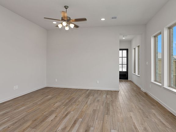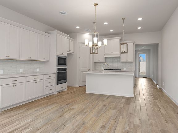 Entry leads to open family room, dining area and kitchen. Large windows and 10-foot ceilings throughout. Kitchen features generous counter space, corner walk-in pantry, 5-burner gas cooktop and large island with built-in seating space. Primary suite includes bedroom with 10-foot ceiling. Double doors lead to primary bath with dual vanities, separate glass-enclosed shower and walk-in closet. Covered backyard patio. Mud room with adjoining closet is just off two-car garage. Representative Images. Features and specifications may vary by community.