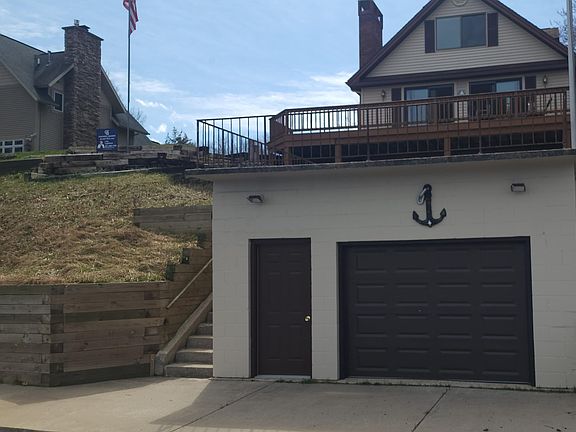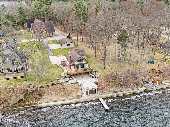 Welcome to your dream lakefront retreat on beautiful Croton Pond. This stunning 3-bedroom, 4-bathroom chalet offers the perfect blend of rustic charm and modern convenience, all set on 90 feet of private waterfront. Enjoy panoramic views from the spacious deck or walk out from the lower level to a serene patio area, ideal for relaxing or entertaining. The walkout basement provides additional living space, perfect for guests or a cozy family room, with brick fireplace. Outside, you'll find everything you need for lakeside living: a concrete boathouse, a 90-foot concrete seawall, underground sprinkling system, attached finished garage, 26 x 36 detached garage with a workshop area. Cement/paved driveway.