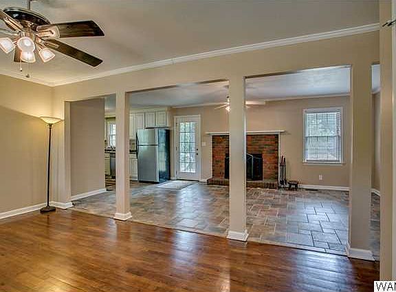 Welcome to your charming new home at 6005 17th St E in Cottondale, AL! This solidly constructed all-brick residence offers a perfect blend of classic style and modern amenities, making it an ideal place to live. Step inside and discover the well-appointed interior. The gourmet kitchen features raised-panel cabinetry, stainless steel appliances, and gleaming countertops. The space is a chef's delight with a designer tile backsplash and shining ceramic tile flooring. The family room also has ceramic tile and boasts a cozy brick wood-burning fireplace with a raised hearth, perfect for relaxing evenings. Throughout the living room and all three bedrooms, you'll find polished hardwood floors that add a touch of elegance. Both bathrooms feature fabulous sinks, tubs, and beautiful tile work. This home offers 3 bedrooms, 2 bathrooms, and approximately 1,271 square feet of living space. The large, fenced-in backyard provides a great outdoor area for recreation and includes a storage shed for your convenience. Additional features include a concrete carport for parking, a laundry room, and central heating and cooling to keep you comfortable year-round. Located in a quiet neighborhood, this home offers a peaceful retreat while still being conveniently located.