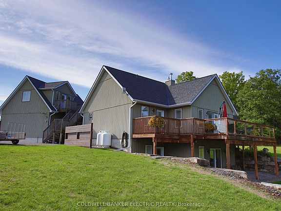 Picture-perfect and perched on a hill with sweeping views of 6.34 acres, this rare find offers over 3,000 sq. ft. of living space and is truly move-in ready. Step into a spacious foyer with plenty of storage, leading you into a chef's kitchen complete with a custom backsplash, high-end appliances, and an induction range. The dining area overlooks the rolling property and natural surroundings, while the great room impresses with its vaulted ceiling and cozy fireplace. The primary bedroom features an updated ensuite with a walk-in shower. Also on the main level, you'll find a convenient laundry room and direct access to the garage through a second large foyer. The lower level offers two bedrooms, an office, a full bathroom, an exercise space, and a generous family room with a wood-burning fireplace and walkout to the backyard. The heated garage includes a workshop and additional storage. From here, stairs lead to a private in-law suite with a kitchenette, bedroom area, washroom, and separate exterior access, making this an ideal multi-generational home with space and privacy for everyone. Set on 6.34 meticulously maintained acres, this home is perfect for entertaining on the wraparound deck or relaxing on the covered front porch to watch the sunset. Just a short bike ride away is the charming Village of Hastings, where you can browse local shops or watch the boats pass through Lock 18. Peterborough and Cobourg are both only 30 minutes away. Don't miss your chance to view this picture-perfect home - tag your favourite Realtor today!