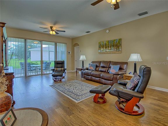 HOT HOT HOT! Exquisitely, fully furnished Balmoral model located in upscale LEGACY of Leesburg! Gently used by snowbirds, this is the first offering of this stylish great room home. Improved by NEW ROOF this year, striking laminate flooring and upgraded stainless steel appliances, this will be your dream home for sure! Meticulously maintained, recently painted interior walls and moldings and more. Easy living in this open concept home that has such curb appeal with an upgraded "C" elevation, tasteful landscaping with curbing. Enter to find the vast great room with 4 panel 8' sliders to the screened lanai and cool breezes. Neutral eat-in kitchen offers broad bay windows, newer stainless appliances, sink, faucet and disposal. Steps to the interior laundry room, complete with stylish, newer machines. The master suite affords all the luxury you might expect: Vaulted ceilings, laminate floor, sliding doors to the lanai, walk-in closet and en suite bath, both with pocket doors. Tasteful finishes abound in the bath: Garden soaking tub, oversized vanity with corian counters and dual china undermount sinks, make up seating area too. The ceramic tiled, step in shower also has glass surround. Guests will appreciate the private wing that features two large bedrooms, both with large closets and lighted fans, and adjacent full bath that sports the same tasteful finishes. There's an existing termite contract and a high-tech security system included. Located in nature-themed Legacy, home to over 200 acres of wildlife sanctuary, wetlands and miles of walking trails. Come and enjoy this desirable community, partake of the full array of amenities too: Beach entry heated pool and spa, cabana area, full fitness center, variety of sports courts and active social hall that features over 90 clubs and social endeavors. This is the one you are waiting for!