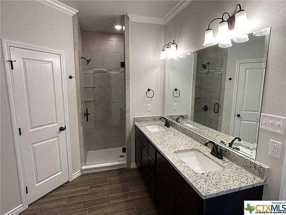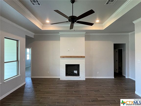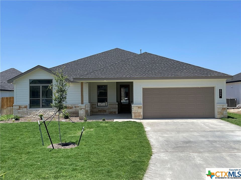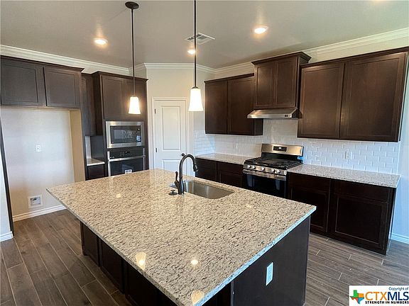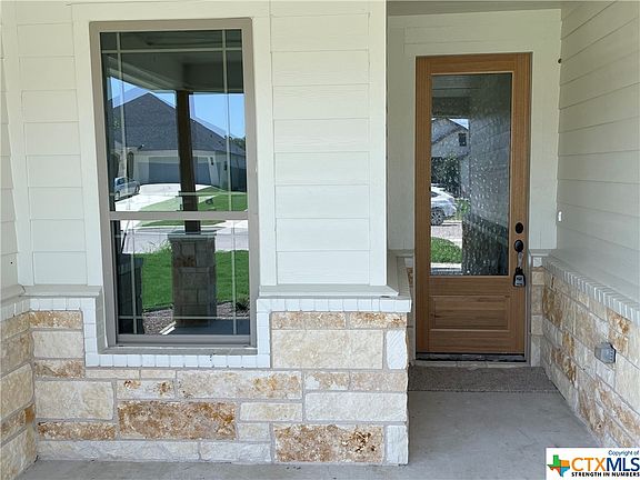 Traditional Masonry with a unique design gives this large home a commanding curb appeal with siding accents on front of home. Graceful entry with masonry accents opens into surprisingly modern interior with Art Deco details. Kitchen is showcased with enormous island, Quick Meal Station™ and well lighted formal dining area. Art Deco Fireplace and coffered ceiling is perfect for entertaining and includes a powder bath for guests. Large laundry area, ample storage and family foyer finish out this traditional floor plan. This home also has spray foam installation in the attic along with a 16 seer HVAC unit which combined provides a high level of energy efficiency. This layout is considered "The Wedgewood." The home includes 3cm granite countertops, sod front and back plus irrigation, cedar fully fenced, SS refrigerator, blinds, and garage door opener. *** Builder does provide title and survey and 1% seller's concessions for closing costs or rate buy down when using preferred lender SWBC in Temple/Killeen! Home Warranty is included***