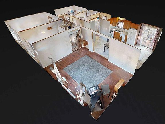 Bright comfortable livingLarge picture windowNatural lightWarm wood-look flooringClassic wood cabinetryWhite appliancesDedicated dining area