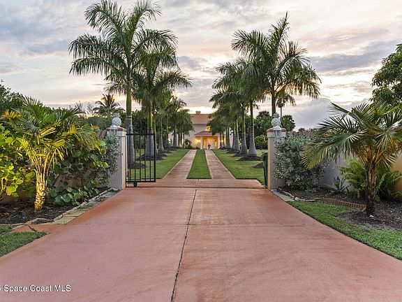 A rare opportunity on the N Tropical Trail, this estate sits on 7.06 acres directly on the Indian River and offers a staggering 6,686 square feet of living space. Designed to combine everyday living with exceptional entertaining spaces including a massive covered breezeway, 4-car garage with entertainment room, a large executive office, and a custom bar. The gated palm lined driveway with fountain makes a statement as you arrive, while inside, the primary suite offers a resort-style bathroom, oversized closet, and a private balcony overlooking the river and expansive grounds. The kitchen is fully equipped with high-end appliances and abundant space for cooking and gathering. The outdoor living is just as impressive, featuring a screened pool and spa, summer kitchen, private dock with covered boat lift, and panoramic sunset views that are second to none. With its unique combination of acreage, privacy, and waterfront lifestyle, this estate is truly one-of-a-kind on the Space Coast.