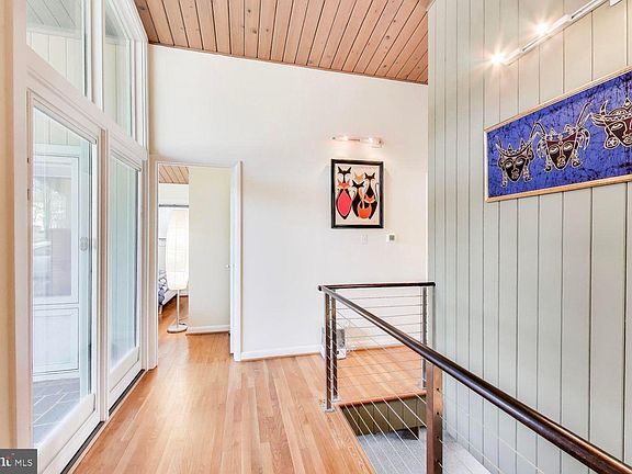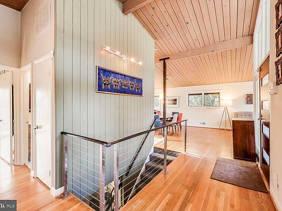 Upon entering, you're greeted by floor-to-ceiling windows that combine with strategically-placed skylights to bring soft natural light indoors. Cathedral ceilings of stained pine, up to 12 feet high, complement an open floor plan to create a unique midcentury-modern feeling of spaciousness. The primary suite is a sanctuary, featuring the same lofty pine ceilings. An oversized closet and ensuite bathroom with custom shower and a Toto bidet add touches of luxury and comfort. A balcony overlooks the heated, below-ground pool. Walk downstairs to the sprawling family room, large enough to accommodate a sectional sofa with space left over for a piano—or an indoor jungle gym for the kids. This level includes an office, laundry room, storage room, and a fourth bedroom with full bathroom. Outside you'll find the pool and landscaped backyard, fenced for privacy. A monitored alarm and exterior video system ensure privacy and security. The home is an easy 4-minute walk to the Wildwood Shopping Center and a 5-minute drive to the Red Line Metro.