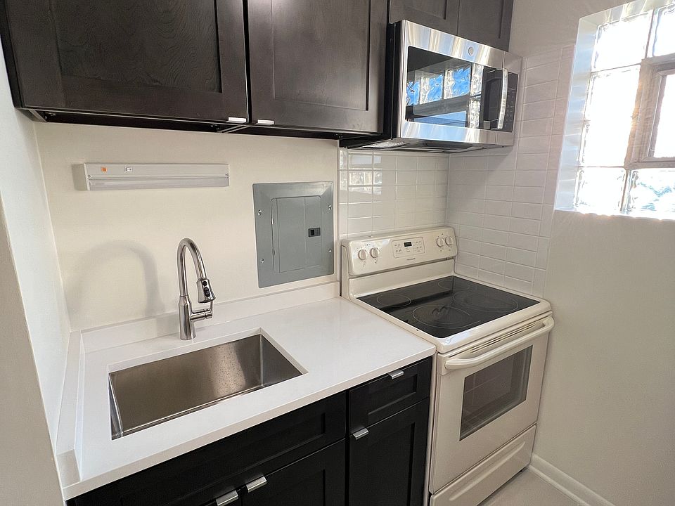 Modern plumbing fixturesCabinet with stone countertopNew kitchen cabinetsStainless steel appliancesNew tileStone countertops