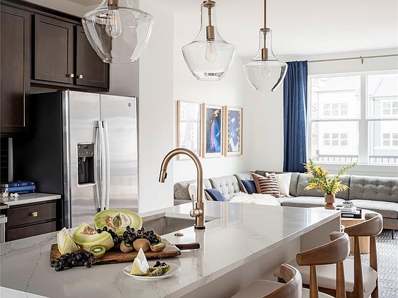The Chef-inspired kitchen exudes style and sophistication with wood toned cabinetry, marble-look quartz countertops, and a beige backsplash.