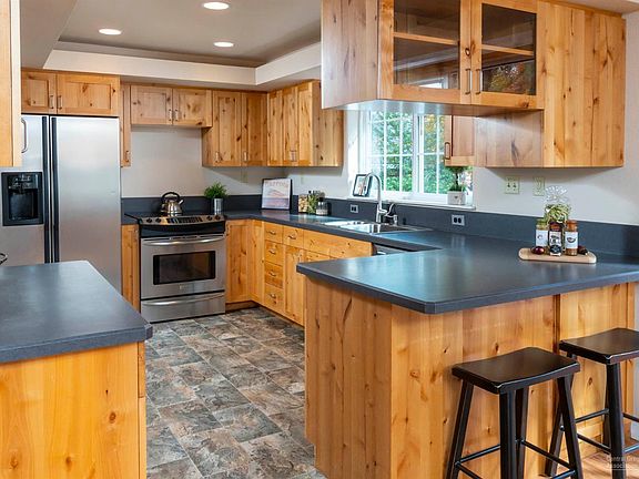 Beautiful spacious home nestled in the pines! Featuring a breathtaking, tranquil back yard and huge deck space. Enjoy your master wing with fireside sitting area, large closet and private balcony.Nice separation between master and guest room. Bonus loft area. Plethora of parking, storage and space for all your toys and hobbies! Includes a nicely tucked away two-bay shop and four-bay storage building. Fire safe storage room in the garage. Roof is less than 10 years old. Remodeled in 2012.