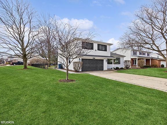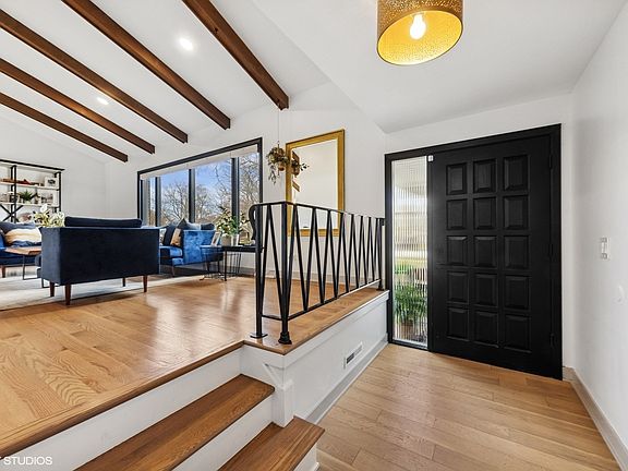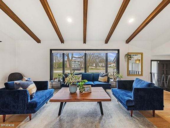 Sleek Mid Century Modern home with an oversized yard. This stunning house is turnkey! The updated kitchen with quartz counters, stainless appliances, large island and floating shelving looks over the huge backyard. Vaulted ceilings in the spacious living room are accented with exposed stained wood beams. The family room with wood burning fireplace is open to the kitchen with patio glass doors leading to the blue stone paver patio. All four bedrooms are on the second floor. The hall bath has a large vanity with plenty of storage. The primary suite offers a private bath and a walk-in closet. Downstairs, there is an additional family room in the lower level with exposed ceiling beams as well as a huge, unfinished storage area with laundry and mechanicals. Design details include decorative metal railings, designer light fixtures throughout the house, hardwood flooring, on trend tiling and a detailed solid wood front door. Fully fenced backyard, mudroom and the large garage is wired for an EV charger. Close to park and schools, minutes to downtown Downers Grove. Nothing to do but move in and enjoy!
