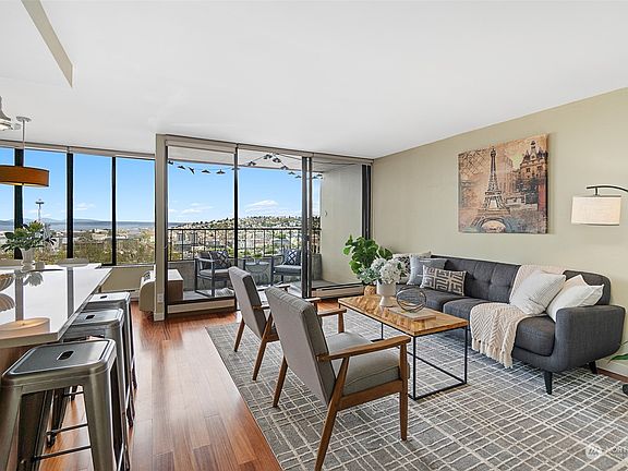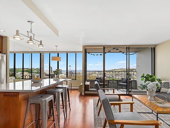 Nestled atop Capitol Hill, this gorgeous home’s wall of windows provides spectacular views of the city skyline, Puget Sound & Olympic Mountains. This spacious one-bdrm features rich kitchen cabinetry w/new countertops, updated bath, hardwood floors & A/C. The open layout is perfect for entertaining & the large balcony provides the perfect perch to enjoy Space Needle & Lake Union fireworks or relax watching golden sunsets. This unit comes with in-unit W/D, deeded parking & extra storage. Amenities incl swimming pool, gym, sauna, community room, workshop, guest pkg & EV stations. HOA incl electricity, cable tv, internet, hot water & w/s/g. Conveniently located to numerous eateries, shops, entertainment & the light rail station. No rental cap.