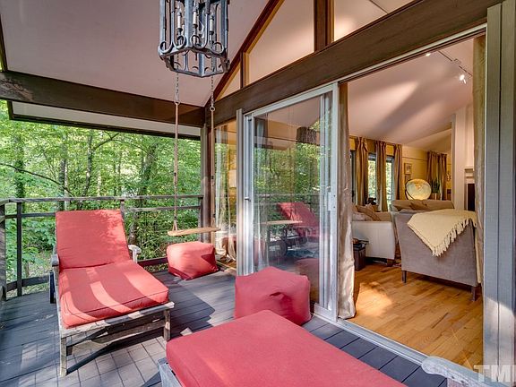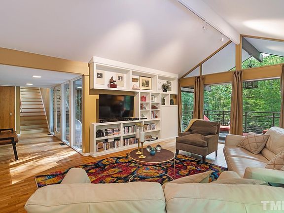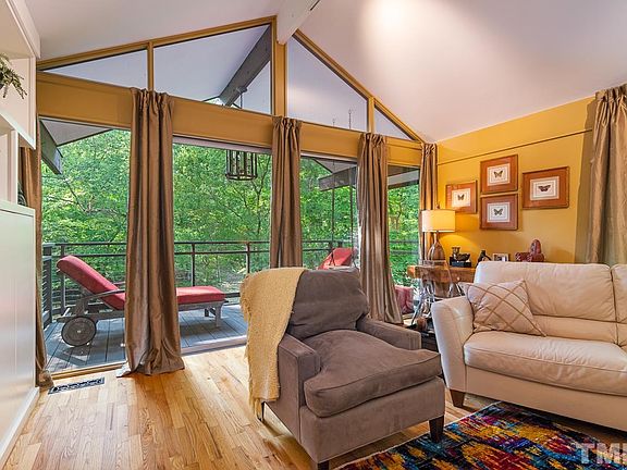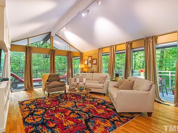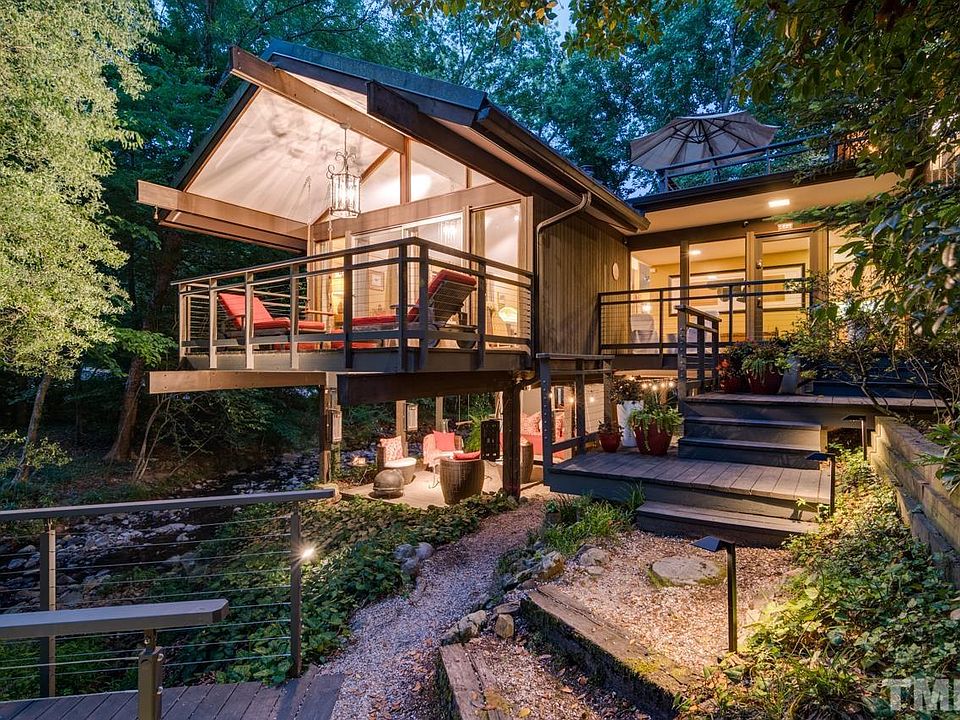 Dramatic modernist house designed by Don Stewart sits on 1.4 acres and straddles Cedar Fork Creek in the heart of Lake Forest. 9 patios and decks provide extraordinary views, abundant entertainment spaces and fill this home with light. Enjoy privileges at private Eastwood Lake. Just a short walk or bike ride on Booker Creek Trail takes you to nearby shops and restaurants including Trader Joes & Whole Foods.
