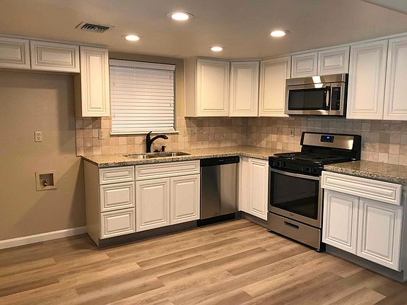 Adorable house recently updated-3 bedrooms/2 baths. Entry, living room, kitchen and hallway have waterproof vinyl planking that looks like wood. All rooms have ceiling fans. Living room has vaulted ceiling , brick fireplace and a French door to the patio. Kitchen has cabinets, granite counters, appliances and recessed lighting. Three bedrooms all have carpet. Washer and dryer hookups in the garage. Back yard has patio. Central heating and evaporative cooler. Besides returning a completed Rental Application, applicant will provide a recent (within the last 30 days) credit report and latest pay stub/leave and earnings statement. No smoking allowed. Owner pays for yard service. Renter pays all utilities.