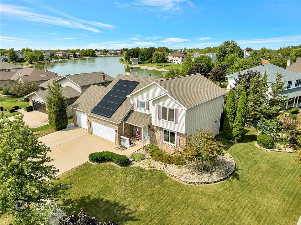 Custom 4BR/3.5BA home on a corner lot with gorgeous pond views. Beautifully crafted custom-built home featuring 4 bedrooms, 3.5 baths, and a heated 3-car garage. Enjoy stunning pond views from the backyard, complete with a spacious deck and 10x12 shed. The main level boasts natural hardwood floors, built-in shelving, a cozy wood-burning fireplace, and a gorgeous eat-in kitchen with granite countertops, island, newer stainless steel appliances, and a pantry. Upstairs, the spacious master suite overlooking gorgeous pond views and includes a full bath with double vanity and whirlpool tub. The fully finished basement offers laminate flooring, a full bath, large rec area, and custom-built bar-perfect for entertaining. Tons of storage throughout! No HOA fees! Furnace, A/C, Roof, Siding, Gutters, and Facia 2015. Water softener 2017, Water Heater 2018, All windows and patio door 2019 with lifetime transferable warranty. 2 Nest thermostats included. 16x7 garage door 18R-value 2021.