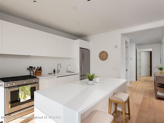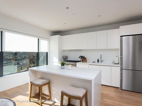 This sought after corner unit with private outdoor space in The Monroe is complete with a modern open kitchen with Dada cabinetry, Liebherr refrigerator, Hansgrohe faucets, and Corian counters. Other features include 7'' hardwood flooring, custom window shades, and whirlpool W/D. The spa-like baths feature designer floor to ceiling tile, modern dual sinks in the primary and a frameless glass shower enclosure with modern light fixtures in all baths. The home comes with assigned parking & bike storage. This pet friendly building has a common rooftop terrace equipped with a gas fire pit, outdoor kitchen and gas grill. Make this your beach sanctuary or great investment in booming Asbury Park. Blocks to the beach and to shopping, dining, and entertainment. Available furnished or unfurnished.