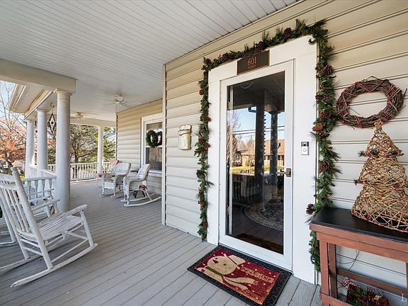 Step back in time with this 1917 Four Square, one of Gretna's original treasures beautifully preserved and thoughtfully updated for modern living. Enjoy the inviting wrap-around porch perfect for rocking chairs and quiet evenings. A lovely foyer welcomes you inside, leading to formal living and dining rooms with high ceilings and hardwood floors. The spacious eat-in kitchen features a large built-in buffet, ideal for family gatherings and holiday meals. A cozy den with gas-log fireplace offers a warm place to unwind. The main-level primary suite provides a private retreat with its own bath and adjoining office. Main level laundry. Upstairs includes four well-proportioned bedrooms, a full bath, and an additional space suited for a library or sitting area. Situated on a level half-acre in town, the property offers a fenced yard, nostalgic Model T garage, carport, multiple outbuildings, and two driveways, plus town water, sewer, and weekly trash service. A true Gretna classic.