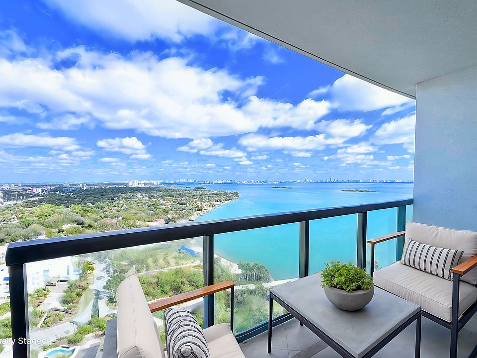 This 2-bedroom, 2.5-bath condo offers 1,158 sq. ft. of contemporary design and stunning Biscayne Bay views from the 25th floor. Features include an open kitchen with quartz countertops, Italian cabinetry, stainless steel appliances, and impact-resistant floor-to-ceiling windows. The spacious layout provides a main bedroom with an en-suite bathroom and walk-in closet, and a private second bedroom with an adjacent bath. Amenities include two heated pools, a spa, sauna, gym, business center, cinema room, BBQ area, and 24-hour valet or self-parking. Located in Edgewater, just minutes from Wynwood, Midtown, and the Design District, this condo offers an unbeatable blend of luxury and convenience. Owner pays for the HOA fee
