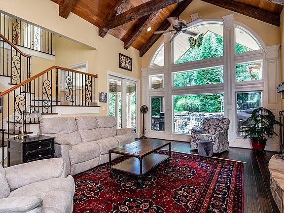 VIEW FROM THE TOP. One of a kind custom home that is truly an architectural masterpiece. Attention to detail, old world craftsmanship and every upgrade that you can imagine. From the foyer to the theatre, the quality is truly second to none. Home features custom cabinetry, with granite throughout, hand scraped floors, hand hewn beams, steam shower, formal dining, open kitchen with breakfast area adjacent to an inviting family room with a timber framed tongue and groove ceiling and stacked stone fireplace. Massive master on the main with dual walk in closets and vanities. On the upper floor there is a large suite with a living/bonus room, wet bar and a roof top deck overlooking the adjacent lot (included with the home). The craftsmanship continues into the basement with a full theatre, large kitchen, living room, safe-room/wine cellar and sleeping quarters. Basement also has a drive under garage with plenty of room for storage. The view from the front porch offers long range views of the 17th fairway. The covered back deck and patio, overlooking the waterfall, serve as a relaxing oasis that can be a source of privacy or serve as a great area for entertaining. Guest house is attached by a breezeway and offers a huge living area, full bedroom and half bath. River Forest is a gated community, offering a championship golf course, full service clubhouse, parks, walking trails, fitness, swim and tennis facilities.