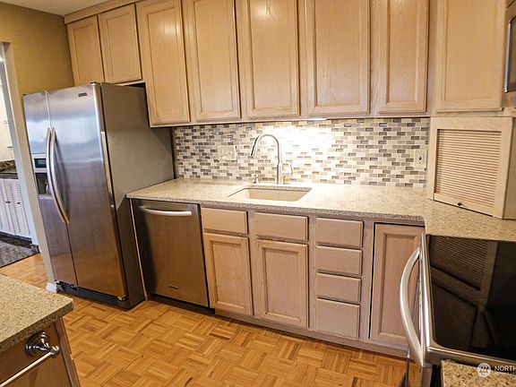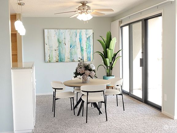 Welcome home to Mariner Manor in the heart of Des Moines' Marina District. Whether you're watching the ships pass by or the weather roll in, you'll love the expansive southernly facing Puget Sound views from the kitchen, dining, living room, and the deck. 2 bd 1.75ba 1,430 sq ft including walls of closets, lrg utility rm, and a spacious primary bedroom and bath with walk in closet. Upgraded kitchen with stainless steel Kitchen Aid appliances. Mini-split AC and view preserving solar shades keep you cool during the warmer months while the granite wrapped fireplace will keep you warm all fall and winter. Gated community with garage parking, secured lobby entry, gorgeous courtyard garden with water feature, outdoor pool, hot tub, & BBQ area