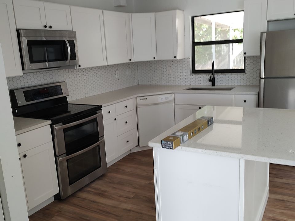 freshly updated flooring, paint, cabinets and appliances, ceiling fans in all rooms, nice large fenced backyard, screened back porch, screened front porch, 2 car garage, window blinds, central heat and air,