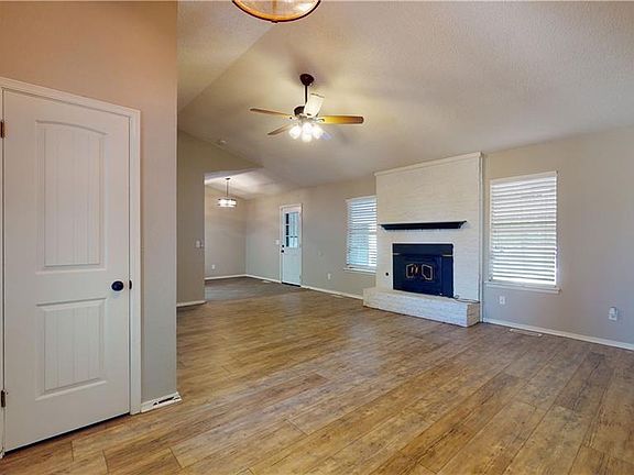 Beautiful home with a walk in storm shelter in the garage. Living has a fireplace and wood look flooring. Kitchen has a breakfast bar and a smooth surface stove. Master has a walk in closet and a remodeled full bath with a shower. Front bedroom has a bay window with a storage bench and a jack-n-jill bath with a tub/shower combo. Laundry room has electric and gas dryer hookups, built in ironing board, shelves, cabinets, and a folding counter. Large backyard is divided by a fence and has two storage sheds and a partially enclosed patio. Located just minutes from I-35, shopping, and restaurants.