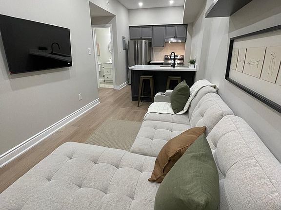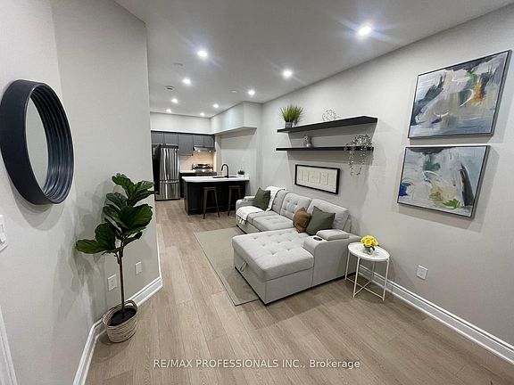 ALL INCLUSIVE, FULLY FURNISHED, totally equipped one bed condo Townhouse. Modern, Renovated w/ potlights & 9 Ft" Ceilings. Completely decorated & furnished w/ Queen bed, desk & chair, sofa/pullout, TV, kitchenware, cookware, linens and towels! Direct outdoor access. Ensuite laundry. One car parking included. Walk to parks, the grocery store, drug store, banks, restaurants. Move-in ready.
