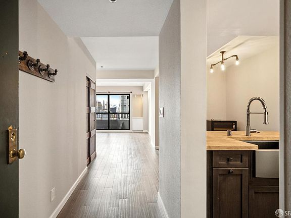 Enjoy views of Downtown San Francisco and City Hall from your private balcony. This bright one-bedroom condo features a thoughtful floor plan and fresh paint throughout. The open kitchen is equipped with a commercial Thor electric range, commercial hood, Kraus apron sink, maple cabinetry, maple butcher block counters, floating shelves, a magnetic knife strip, subway tile backsplash, and upgraded faucet hardware. The dining area includes a statement chandelier, pine and redwood closet doors. The bathroom is updated with vinyl flooring, tiled walls, medicine cabinet and shower over tub. The bedroom offers blackout curtains, double-pane windows, a maple butcher block windowsill, and a custom 6-module mahogany closet system. The previous owner installed bamboo flooring throughout. Opera Plaza offers 24-hour security, pool/spa, gym, concierge, racquet courts, and on-site shops/dining. Ideally situated near the Opera House, Symphony, Ballet, City Hall, and SFJazz, with easy access to Hayes Valley, Downtown, and the Valencia Corridor. Leased parking available in the building.