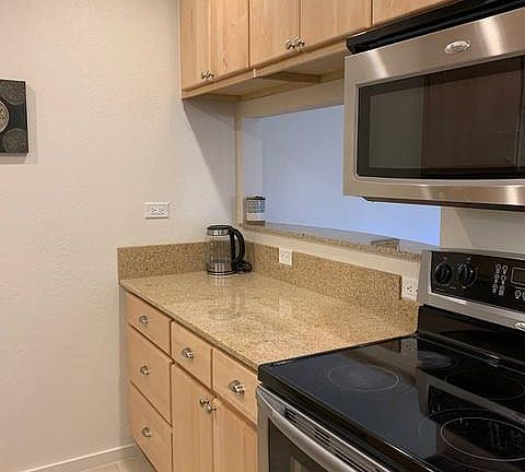 Unit features stainless appliances, (range, dishwasher, microwave), granite counter tops, hickory cabinets, ceiling fan, stackable washer/dryer, leather sofa, deluxe bed, balcony with view of pool, TV..