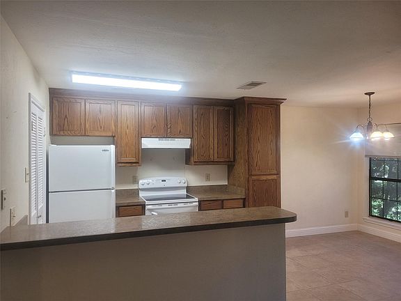 Decorative wood burning fireplaceBack patioSeparate laundry areaWhite kitchen appliances