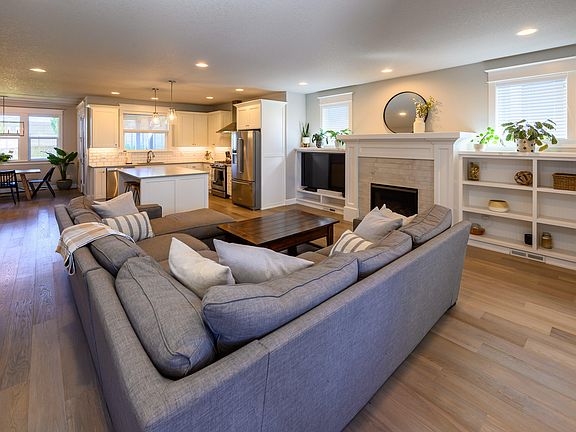 Highly upgraded & nearly new main floor primary 5-bedroom home w/great room layout located only a few hundred yards from Alpenglow Park & Caldera High School. Upon entering the foyer, you are greeted by 9' ceilings, built in entertainment center w/fireplace, a spacious/functional great room & a main floor guest bedroom w/pocket doors for privacy. The kitchen features solid quartz counters, an island w/breakfast bar, stainless appliances, single bay sink, undercabinet lighting, pantry & an adjacent dining area that fits even the largest tables. The primary suite is acoustically isolated on the main floor, fits a king bed w/end tables along w/TV entertainment equipment & seating area, has a tile shower w/glass door, tiled double vanity, enclosed toilet, & well-organized closet. Upstairs you'll find 2 larger guest bedrooms, a conventionally sized 3rd bedroom, & a guest bath w/double vanity. The private back yard is landscaped & has a covered patio & the double garage has a workshop space