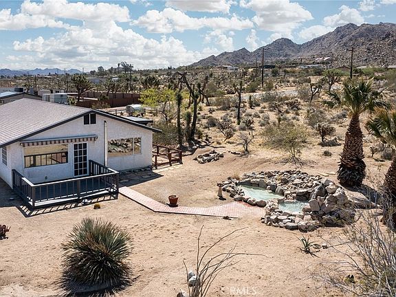 BEST VALUE HOUSE IN JOSHUA TREE w unobstructed Wilderness Views: Gaze out the front window at SoCal’s tallest mountain – snowcapped San Gorgonio. Sit on the private covered side porch with an evening beverage or just peaceful relaxation and take in the views. Hike from home into the National Park. Sit on the front deck with an electric retractable porch-cover and enjoy the surrounding wilderness, with the fountain gurgling away nearby for wildlife to feed from. In many ways, this is the coolest current nature crib in JT near this price range. When one thinks about moving to Joshua Tree to immerse themselves in nature and unspoiled desert, the land and mountains near this home are what one envisions. But even better is that this home is located on a paved road for easy access to town. Exterior fascia, soffit and decks are newly painted. Interior kitchen ceiling newly refinished, deleting florescent lights and replacing them LED lighting. Much of the interior is also newly painted. FULLY PAID SOLAR. Recently installed ductless mini-split zoned AC/Heating units to replace the older central air system and swamp cooler on roof. Cozy living room w giant window facing snow covered mountain. Living room and main bedroom both have vaulted, open-beam ceilings providing an expansive feeling. Main bedroom also has midcentury inspired windows facing the mountains to the south and also, like the living room, includes a giant window facing the mountains to the west. Two full bathrooms. Entry vestibule & coat closet. Enclosed garage. PURCHASE INCLUDES CAMPERVAN with a full-priced offers. Campervan or no, this is one of the most down-to-earth, wilderness abodes at the edge of Upper Friendly Hills. It doesn’t get much better than this. Sneak by and grab a seat at sunset in one of the two Adirondack chairs to confirm this to be the coolest, private side porch in JT! Views from the porch of vast wilderness and National Park mountains. Side porch is shaded, good for rain, snow and sleet so you can sit outside tucked away in your own private corner of paradise and take it all in. Porch includes a short fence to protect young children or small dogs and provide outdoor play space. Palm trees, a fountain w a waterfall, numerous joshua trees, and forever views in nearly all directions and infinite views into the galaxies above, better illuminated by a local Dark Sky Ordinance. Come see this affordable dream home today!
