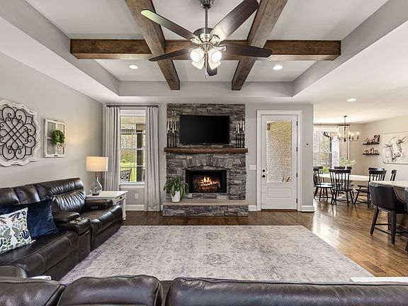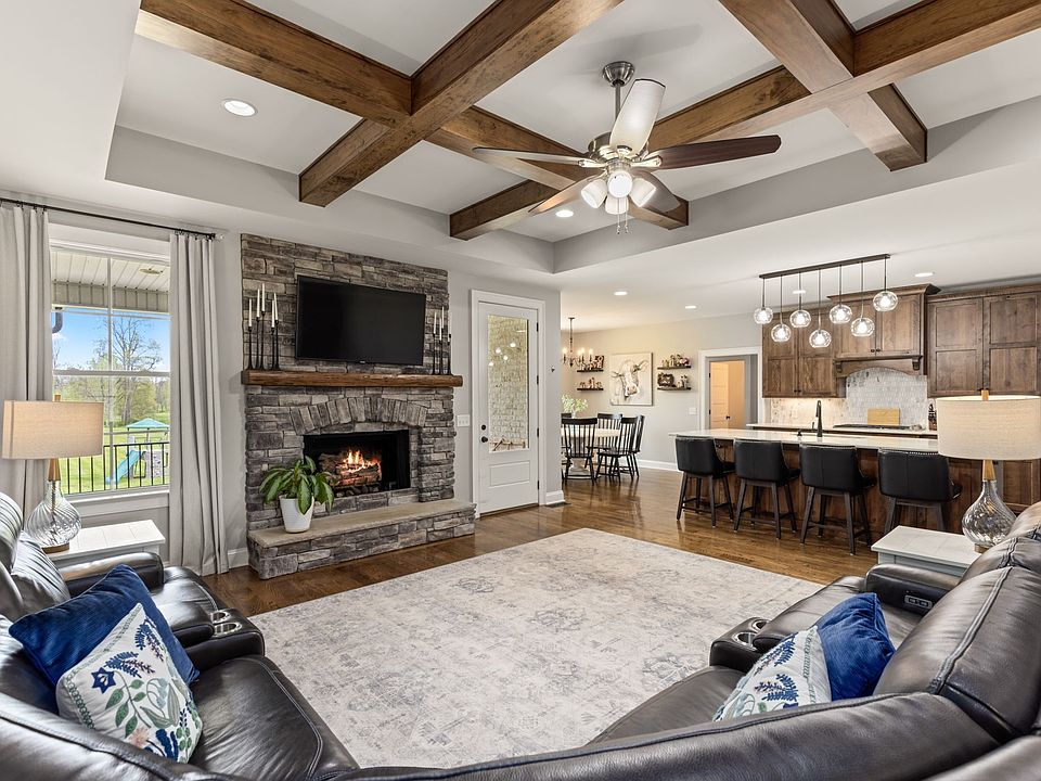 Covered porchStone gas fireplaceOversized garageLarge metal buildingWood-beam coffered ceilingsCustom countertops