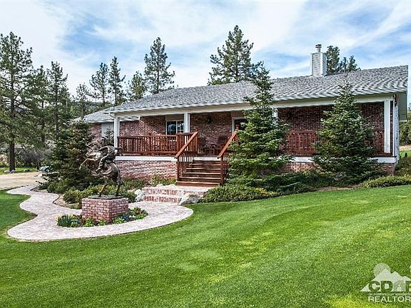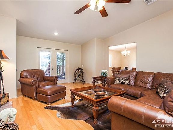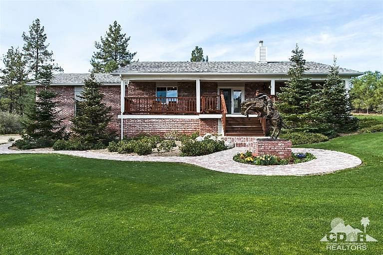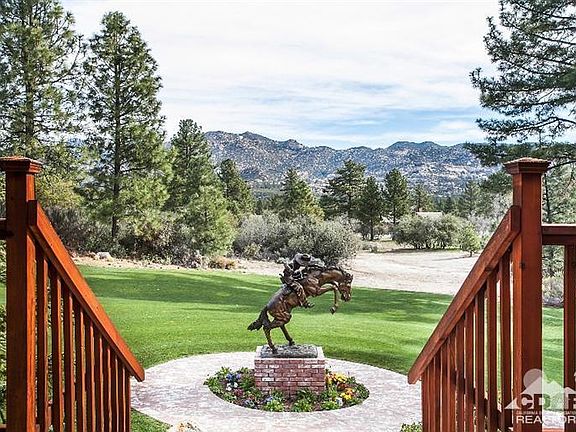 One of a kind Garner Valley ranch home set on a park like setting beautifully landscaped complete with a huge pond with waterfall and a driveway bridge leading to the home and expansive carpet like lawn. A stately life size Remington statue graces the front entrance. The home features a charming covered front porch to sit and enjoy the beauty of the serene rolling lawns and picturesque water features. The inside of the home features a great room with french doors a brick fireplace with raised hearth and insert. The adjacent gourmet kitchen features marble counter tops and large bar great for entertaining along with the adjacent formal dining room. The master suite and bath feature a relaxing spa tub. The opposite side of the home feature 2 guest rooms. A cosy covered patio located off the great room and kitchen to enjoy the evening sunsets.