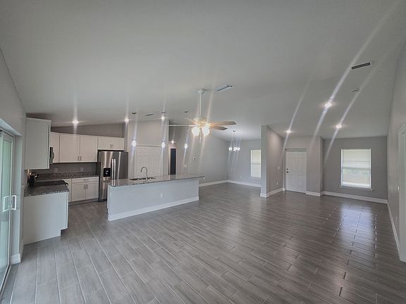 Welcome to a modern custom-built home nestled in the heart of Lehigh Acres, FL. Very close to Buckingham, in a tranquil private setting. This newer construction home boasts a spacious three-bedroom, two-bathroom layout with a split floorplan for added privacy. The primary bedroom has his and hers closets, also features an en-suite with dual vanities and a huge walk-in shower with two shower heads. The kitchen is a chef's dream with stainless steel appliances, granite counters, wood shaker cabinets, and a large island. The home is filled with natural light, highlighting the beautiful tile flooring throughout. The vaulted ceilings in the living room add to the spacious feel of the home. The property sits on a large quarter-acre lot with a sizable backyard, perfect for pets. Enjoy the Florida weather on the large front porch or through the triple sliding door leading to an open lanai. The home also features a two-car garage with an access door and opener, inside laundry with washer and dryer hook-up. Impact windows to ensure your family is safe in any storm. Conveniently located close to all amenities in Lehigh Acres and Buckingham, this home is move-in ready. Don't miss out, see it today!