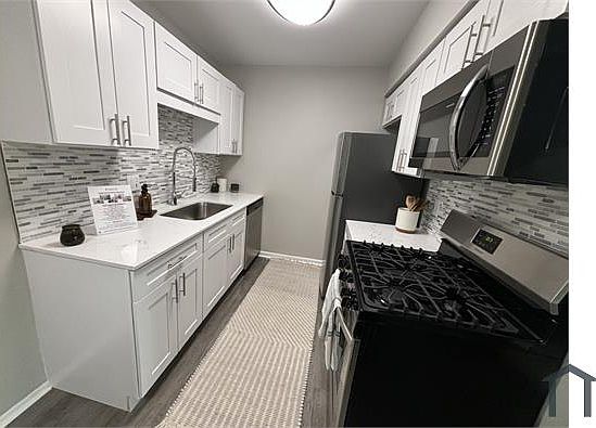 Vinyl plank flooringStainless steel appliancesWhite cabinetsBeautiful back splash tiles