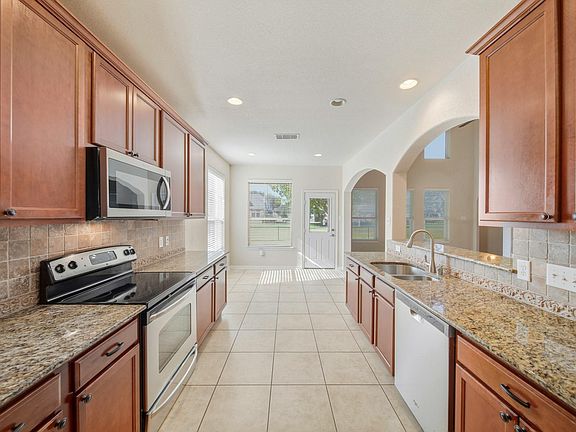 Welcome to this spacious and inviting Rosenberg home offering comfort, functionality, and charm. The bright living room features high ceilings and a cozy fireplace, creating a perfect space for relaxing or entertaining. The kitchen includes a breakfast bar that opens to the living room and flows seamlessly into the formal dining area—ideal for gatherings. The primary suite is a peaceful retreat with dual sinks, a vanity area, a soaking tub, a walk-in shower, and a generous walk-in closet.