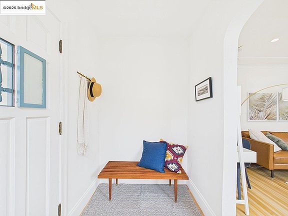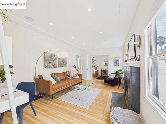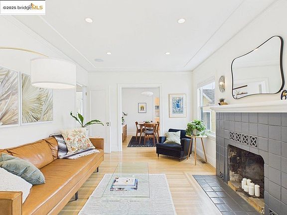 Welcome to 6015 Mauritania, a stylish 2BD/1BA Millsmont retreat blending charm + modern design. Updated w/ refinished floors, a contemporary kitchen & bath, & a sun-drenched deck overlooking a beautifully landscaped backyard; home is ideal for relaxed living & entertaining. Spacious basement offers bonus office space, wine cellar, workshop, laundry room,& garage access. Inside, warmth & light flow through hardwood floors, arched openings, & curated details. Foyer opens to a bright living room w/ the original fireplace mantle & great natural light. Built-in speakers & recessed lighting! Open sightlines between the living, dining, & kitchen areas create easy flow. Dining room features floor-to-ceiling windows, built-ins, & an Eames-style pendant. The kitchen is beautifully appointed w/ quartz counters, skylight, blonde cabinetry, & newer stainless appliance package including fridge, microwave, Bosch dishwasher, and Bosch gas stove. Bedrooms are peaceful, w/ verdant views, primary has deck access. The landscaped backyard includes citrus trees, curved path,& multiple outdoor areas. Upgraded systems: compliant sewer/sidewalk, central heating, & tankless water heater. Close to 580/13, express Transbay NX3 bus line to downtown SF, BART, parks, and the Laurel District.